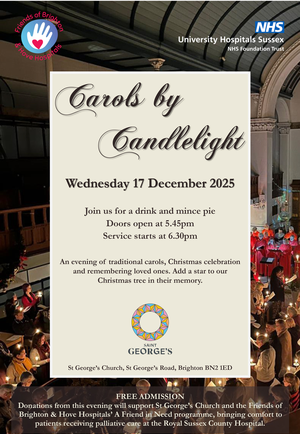 All donations from the evening will support St George’s Church and our A Friend in Need programme, bringing comfort to palliative care patients at the Royal Sussex County Hospital.